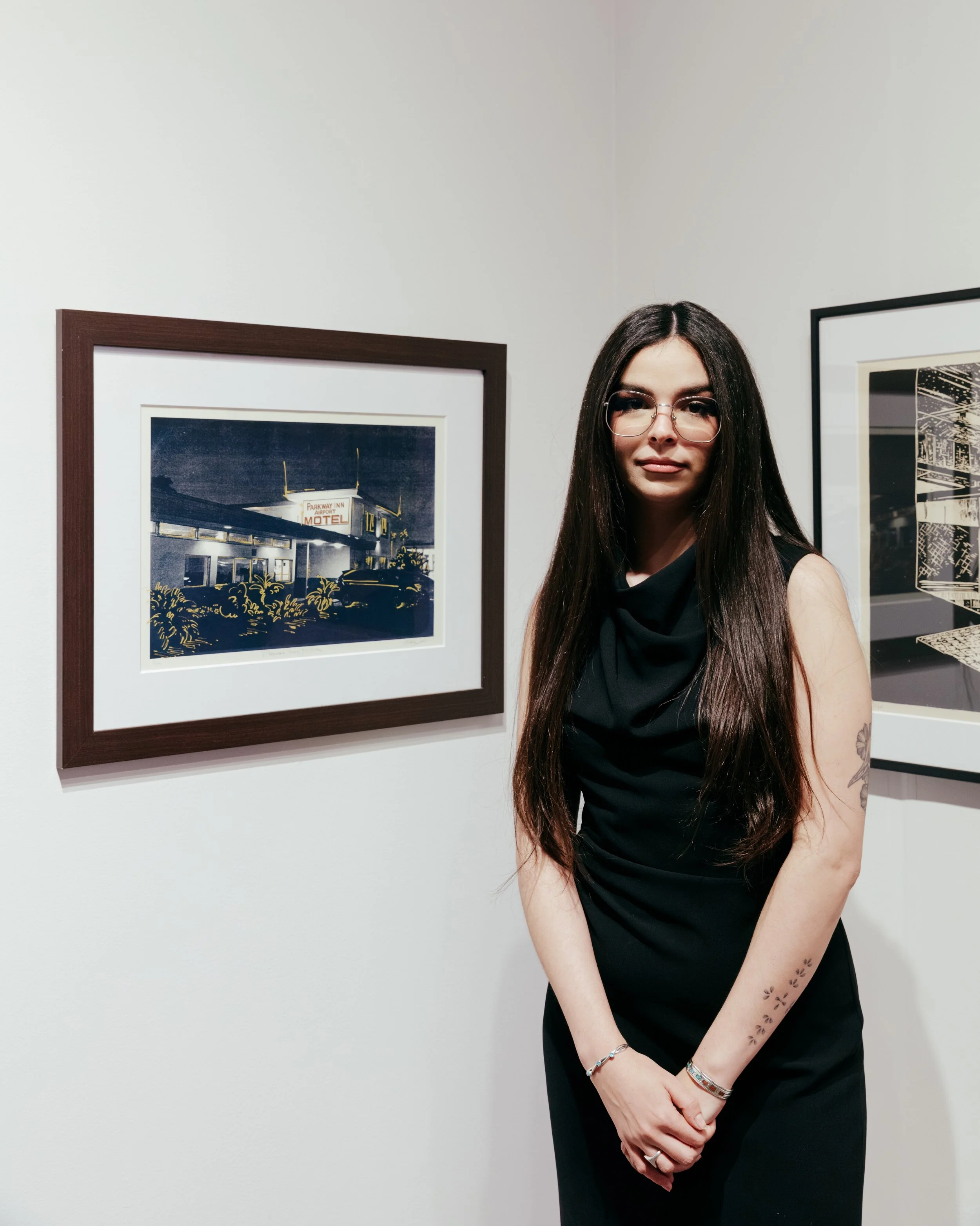 Paloma Valencia is a printmaker and painter based in Chicago, Illinois. Originally from Miami, she graduated from the School of the Art Institute of Chicago in 2019 with a BFA in Printmedia. Rooted in street photography, her work reflects on American identity by documenting the familiar architecture of laundromats, diners, gas stations, and other everyday spaces.